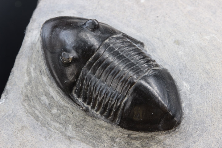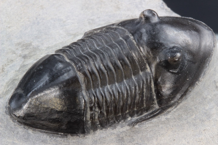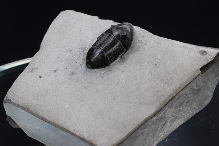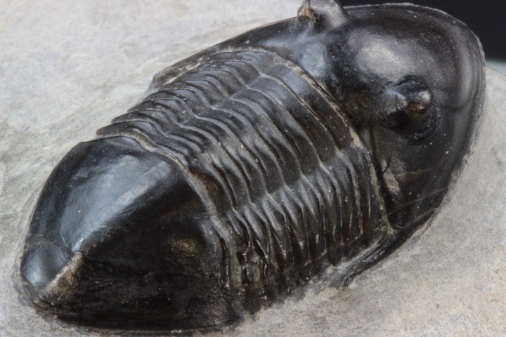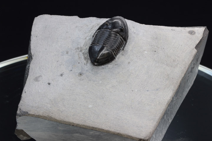 全身マットな黒色の外殻にシンプルなボディは、何処となく高級感ある魅力を漂わせています。標本はほとんど傷も無く美しい保存状態で、特に無数に開いた頭部の小さな穴や体節のディテールは見事です。