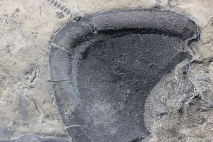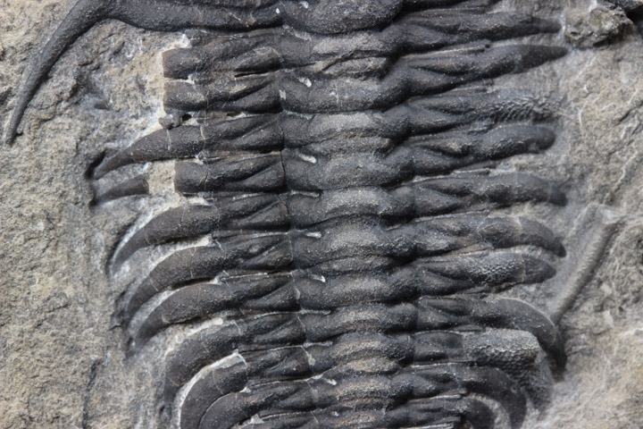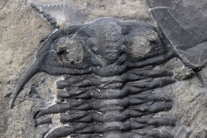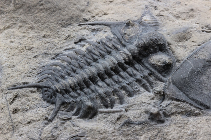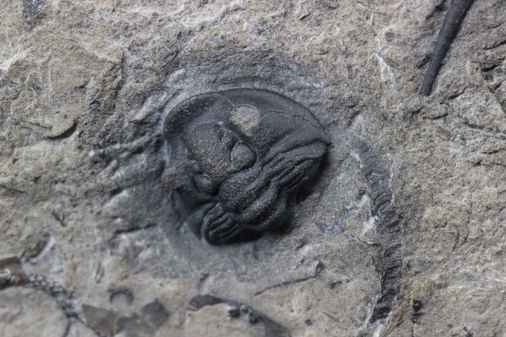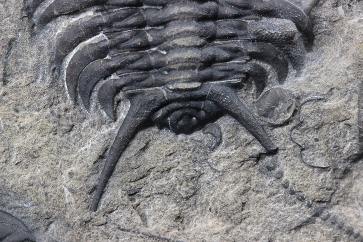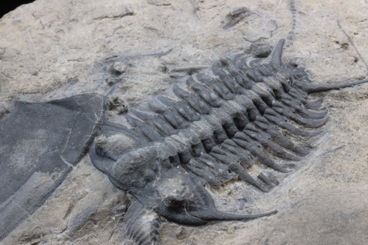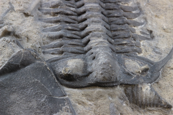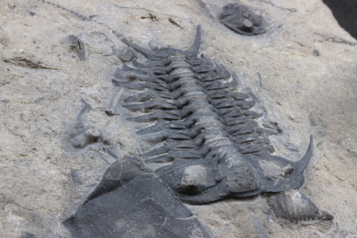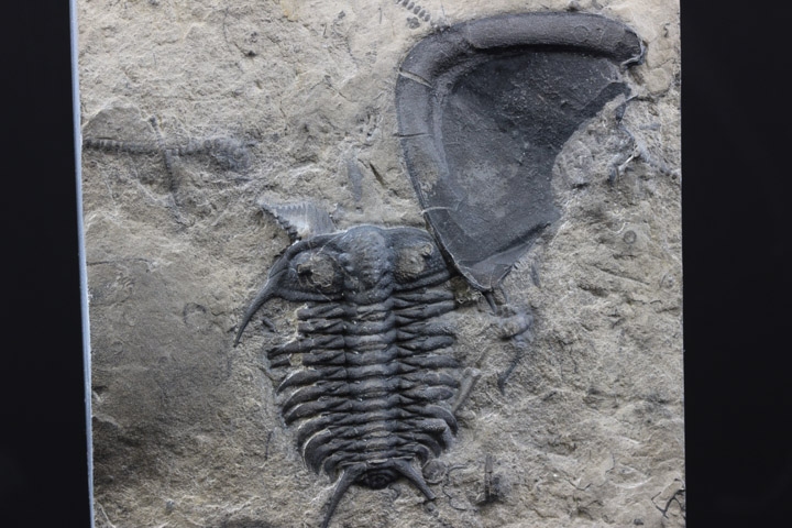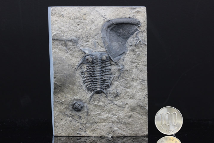 更によく見るとエンロール姿のレア三葉虫、フレキシカリメネ・セナリアの姿もあり、一つのプレートに贅沢な三葉虫たちが集まった標本といえます。