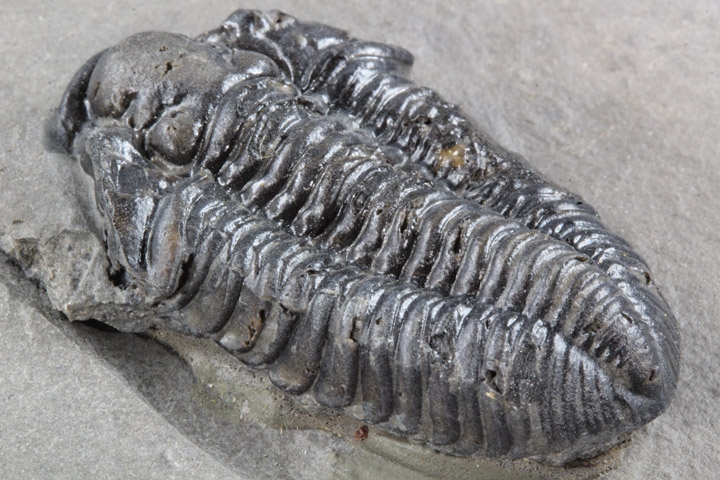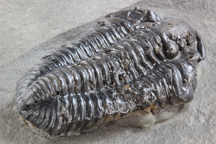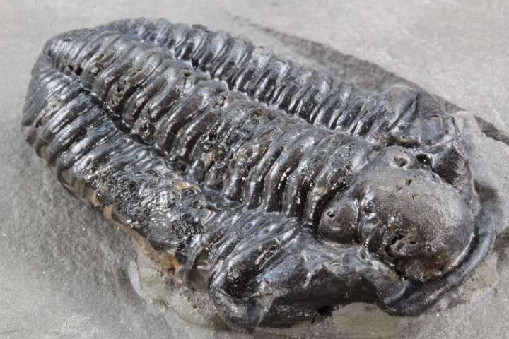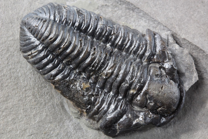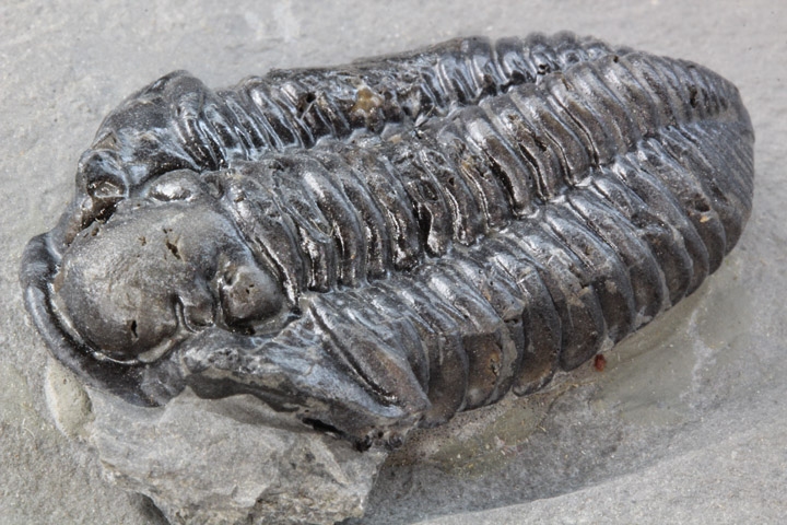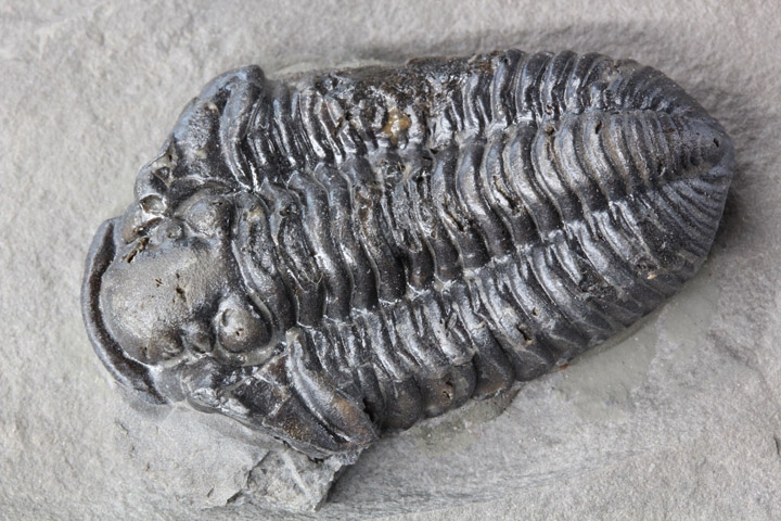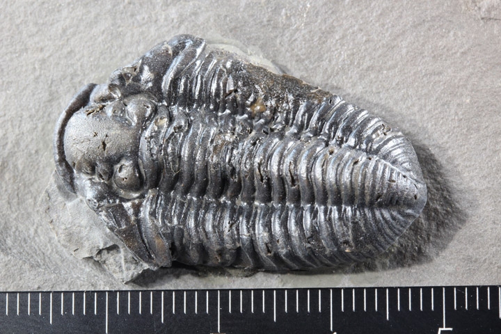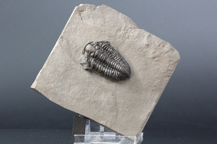 本種はシルル紀後期に生息していた三葉虫で、幅広の頭部と大きな頭鞍部、そして離れた複眼が特徴的です。