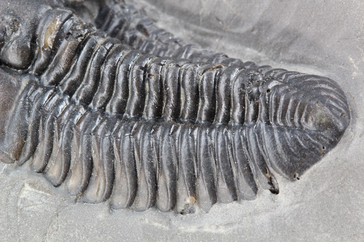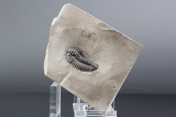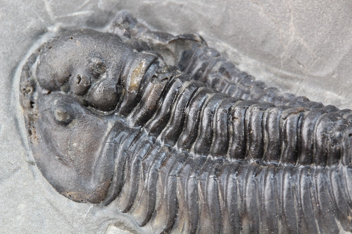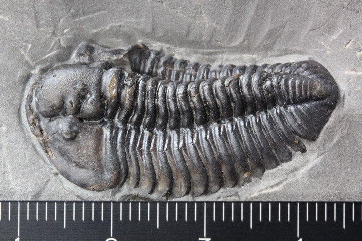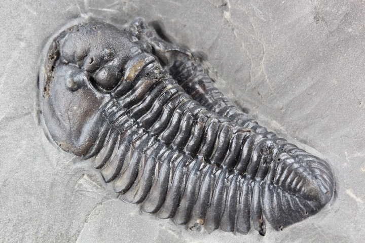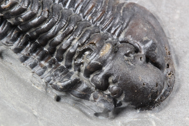 本種はシルル紀後期に生息していた三葉虫で、幅広の頭部と大きな頭鞍部、そして離れた複眼が特徴的です。